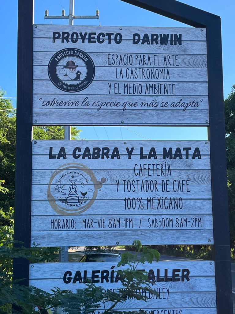 We did a few early inland rides out to a coffee shop we found. It’s called Proyecto Darwin and it is a coffee roaster/shop, gallery space, and climate action advocate. It’s located on the highway towards Valle de Banderas in a rural area but the space itself is very peaceful; there is great music playing, good food, and amazing coffee. The buildings are a mix of wood and metal and the vibe is very chill. As is true in all Mexican establishments there are the resident cats and dogs just hanging out.