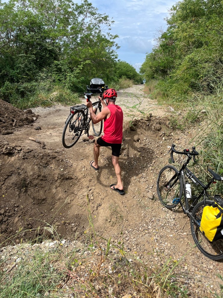 Now this was a very long, straight road. And it was very hot with a head wind. It felt like we were going to pedal forever and get nowhere. There were no pueblas along the route until almost Merida so we were on our own. Nick had a puncture and we found a shady spot to change the tube. The moment we stopped riding the heat just slammed into us and we were slick with sweat. It was going to be a long ride.